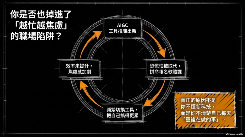 於是,很多人開始拼命去報名各種軟體課,想要把所有工具都學會。但現實往往是,工具學了一大堆,工作效率卻沒有真的提升,反而因為要切換各種軟體,把自己搞得更累、更焦慮。