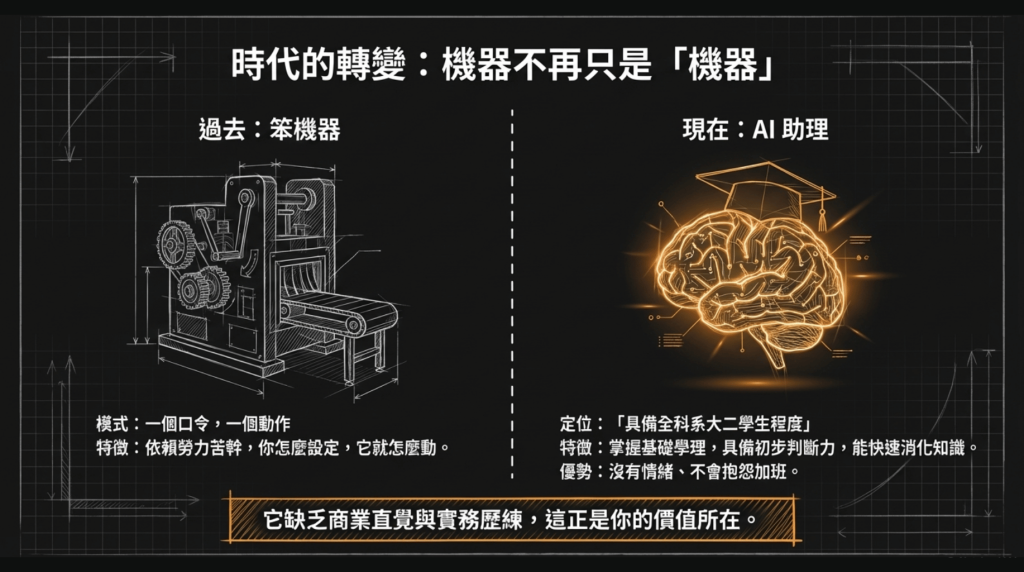 你可以想像,現在的AI就像是一個「具備全科系大二學生程度」的超級助理。最棒的是,這個助理還沒有情緒,不會抱怨加班。你可以把所有行業的基礎知識都丟給這個助理,它都能幫你快速消化。