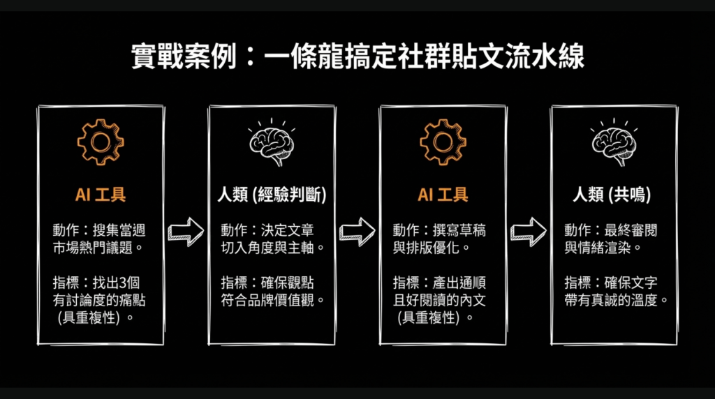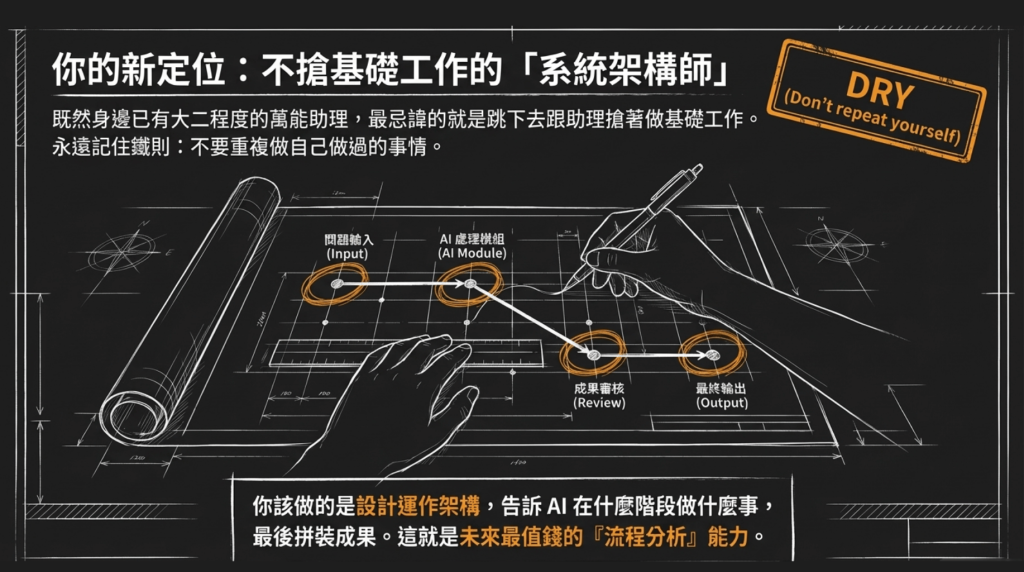 你真正應該專注的,是找出「只有人類能做的事」。也就是你要去設計這整套運作架構,告訴你的AI助理,在什麼階段該做什麼事,最後要把成果拼裝成什麼樣子。這才是未來職場最值錢的『流程分析』能力。