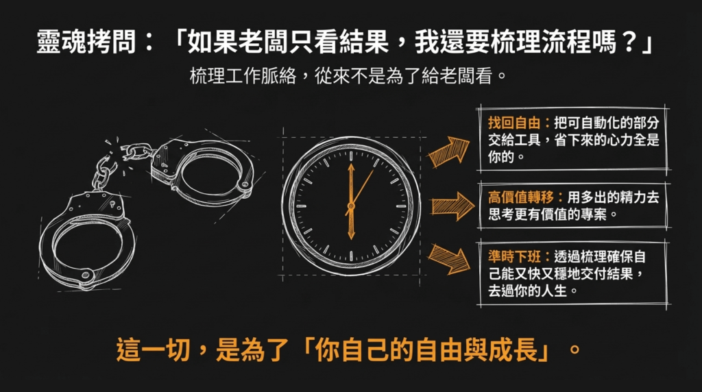 這其實是很多人的痛點。但你要知道,梳理工作脈絡從來不是為了給老闆看,而是為了「你自己」的自由與成長。