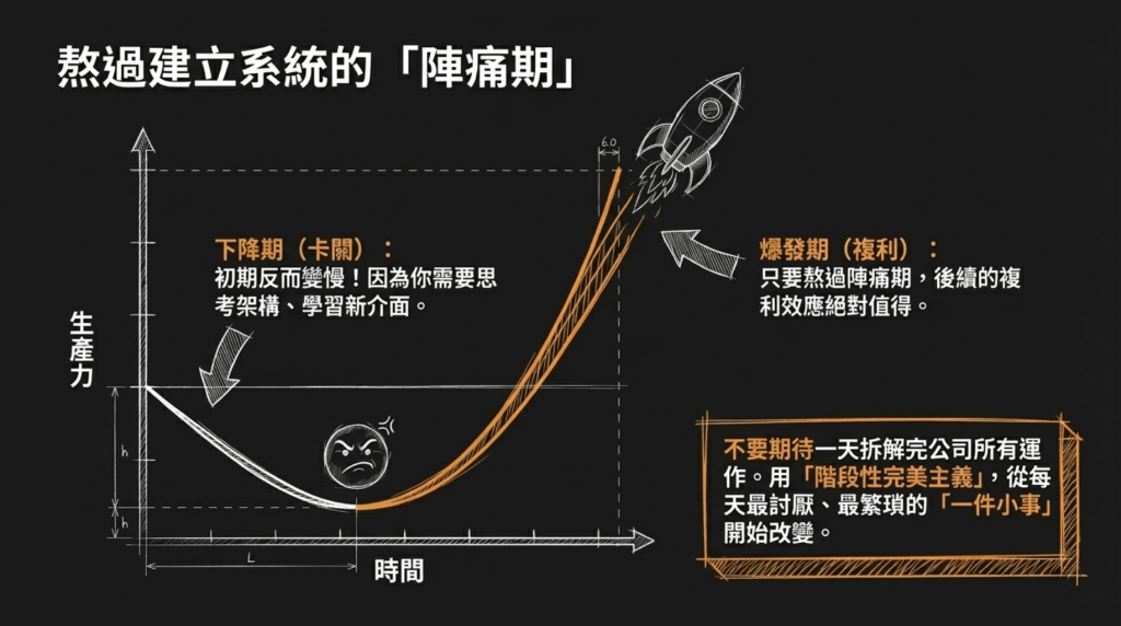 最常見的挫折就是「初期反而會變得更慢」。因為你得停下手邊熟練的動作,去思考架構、去學習新工具的介面,這會讓人有一種進度嚴重落後的焦慮感。