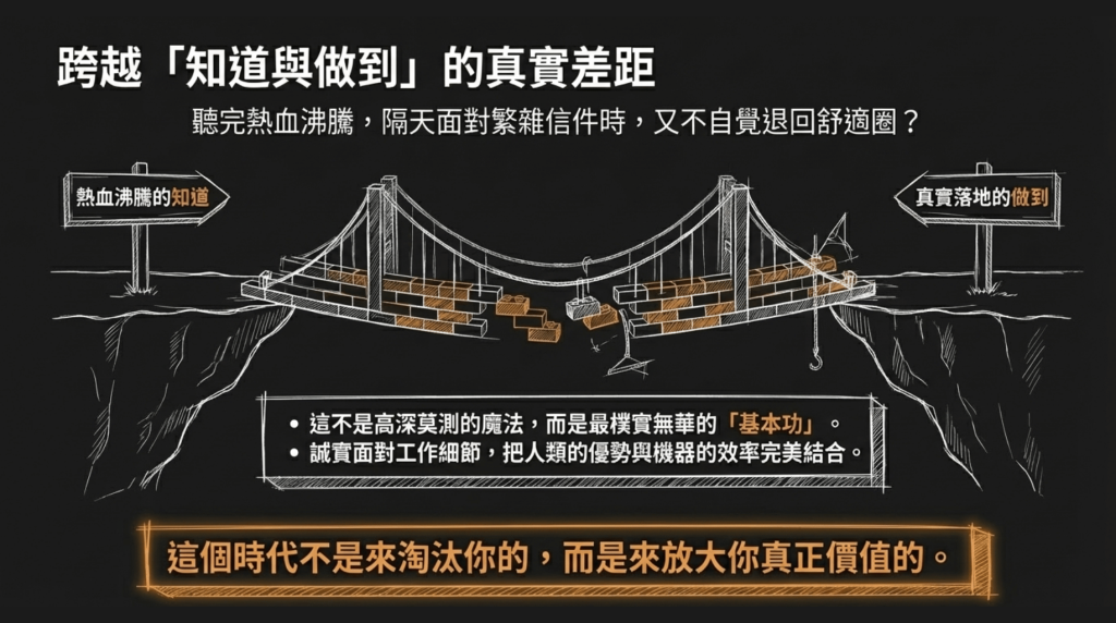 當你願意靜下心來,誠實地面對自己的工作細節,把人類的優勢與機器的效率完美結合,你就會發現,這個時代不是來淘汰你的,而是來放大你真正價值的。